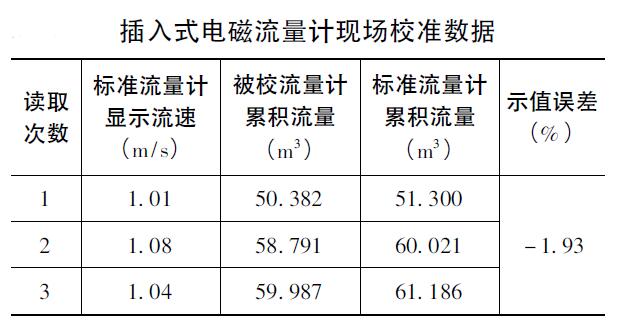 從表中可以看出,在插入式電磁流量計(jì)的現(xiàn)場(chǎng)標(biāo)定和實(shí)驗(yàn)室溯源安裝的相同條件下,大口徑插入式電磁流量計(jì)的在線標(biāo)定誤差為-1.93%,基本上 滿足客戶的測(cè)量要求。
