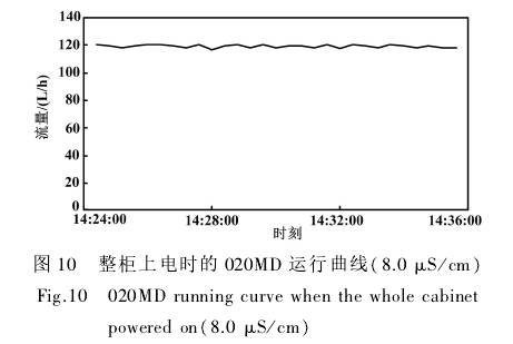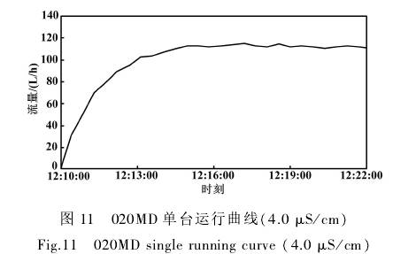 由上可知,流體電導(dǎo)率的高低對(duì)采集的信號(hào)強(qiáng)度有直接影響。 當(dāng)電導(dǎo)率低時(shí),來(lái)自電極的信號(hào)反饋較弱,干擾的影響更明顯。 低電導(dǎo)率的流量測(cè)量對(duì)信號(hào)采集有更高的要求。 壽命終止時(shí)測(cè)得的介電導(dǎo)率約為4.0μs/ cm。 在這種情況下,電導(dǎo)率降低到4.0μs/ cm。 運(yùn)行一段時(shí)間后,觀察到020MD單機(jī)運(yùn)行穩(wěn)定。 操作曲線如圖11所示。