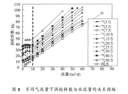 在井筒內(nèi)充滿靜水的情況下,當(dāng)氣體流量為2.5m³/d時(shí)啟動(dòng)兩個(gè)流量計(jì)。汽輪機(jī)的啟動(dòng)排量與純水相近,啟動(dòng)流量遠(yuǎn)低于單相氣體。原因可能是當(dāng)單相氣體以較低的流速通過渦輪時(shí),由于氣體具有可壓縮性,因此氣體更容易繞過渦輪而流過葉片與機(jī)殼之間的間隙。只有一部分氣體可以驅(qū)動(dòng)渦輪葉片旋轉(zhuǎn)。在底水的情況下,在低流速氣/水氣泡流的情況下,輕相氣體傾向于沿著管芯向上流動(dòng)。由于液相中水的不可壓縮性,很大比例的氣泡只能通過渦輪葉片帶動(dòng)渦輪旋轉(zhuǎn),因此啟動(dòng)流量低于干氣。
