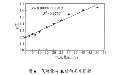 渦輪流量計(jì)響應(yīng)與水流量的直線斜率(即K值)是用10m³/d及以上的水相流量數(shù)據(jù)計(jì)算的,保持氣體流量不變。 然后制作了氣體流量與K值的關(guān)系圖,如圖6所示。