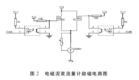 圖中的勵磁電路工作內(nèi)容是控制儀表的工作磁場。其作用原理為 :單片機 MSP430F2418 定時器產(chǎn)生了雙頻矩形波,并經(jīng)光耦隔離后與兩片場效應管組成了開關電路,從而實現(xiàn)了泥漿流量計使用的通斷功能。另一個電路 DH902 是恒流管,其為設備使用提供恒定的勵磁電流。具體來說,當 MCU 定時器的脈沖寬度調(diào)制(PWM)輸出后,經(jīng)過濾波就能有效控制勵磁電流的幅值,進而產(chǎn)出雙頻矩形波。如圖 2 所示,為電磁泥漿流量計勵磁電路圖。