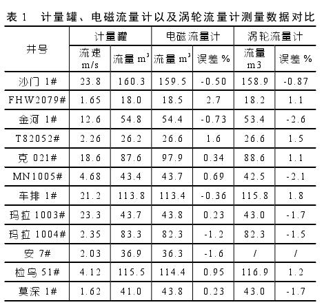 以內(nèi)徑為 DN50 的電磁泥漿流量計應用固井測量過程為例,技術應用人員將高壓由壬接入泥漿管線。此過程,測量人員要將其與串接的渦輪流量計進行分析比較,以實現(xiàn)標準計量罐測試的準確性目標。設備應用人員將計量鉆井泥漿的密度范圍控制在 1.15~2.50 g/cm3之間,而對于固井施工現(xiàn)場一次性替漿量,技術人員應將其控制在 18~160 m3之間,替漿瞬時流量則應控制在 0.2~2.8 m3/min 之間。如表 1 所示,為某固井采用計量罐、電磁流量計以及