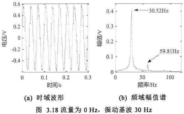 當(dāng)沒有流動時,如圖3.17所示的振動臺會提供30Hz的水平周期性振動干擾,振動幅度為0.6mm。 使用示波器收集渦街流量計傳感器的輸出信號。 此時,輸出信號的時域波形和頻域幅度譜的局部放大圖如圖3.18所示。 采樣頻率為2500Hz,采樣時間為10s,F(xiàn)FT點為2048。根據(jù)圖3.18(b),基波的真實頻率為30Hz,峰值頻率為30.52Hz。 二次諧波的真實頻率為60Hz,峰值頻率為59.81Hz。