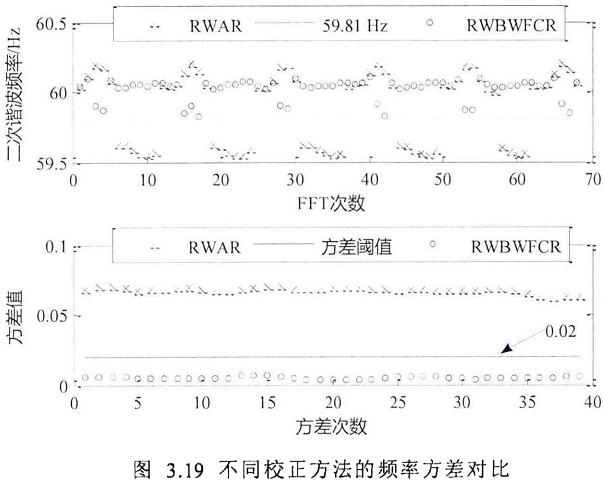 基于10S采樣數(shù)據(jù),計算了69個FFT。 RWAR方法和RWBWFCR方法用于估計二次諧波峰值的頻率。 分別計算30個相鄰頻率估算值中每個估算值的方差。 圖3.19顯示了使用不同方法進(jìn)行校正時獲得的頻率方差的比較。 從圖3.19中可以看出:(1)由于RWAR校正方法的抗噪能量差,因此錯誤地確定了校正方向。 頻率估計的誤差增加了,諧波干擾的方差超過了最終的頻率方差法,諧波干擾被誤認(rèn)為是流動頻率,從而影響了渦街流量計的測量精度。 (2)RWBWFCR校正方法具有很強的抗噪能力,真實地反映了干擾信號波動小的規(guī)律,保證了頻率方差法的可靠性。